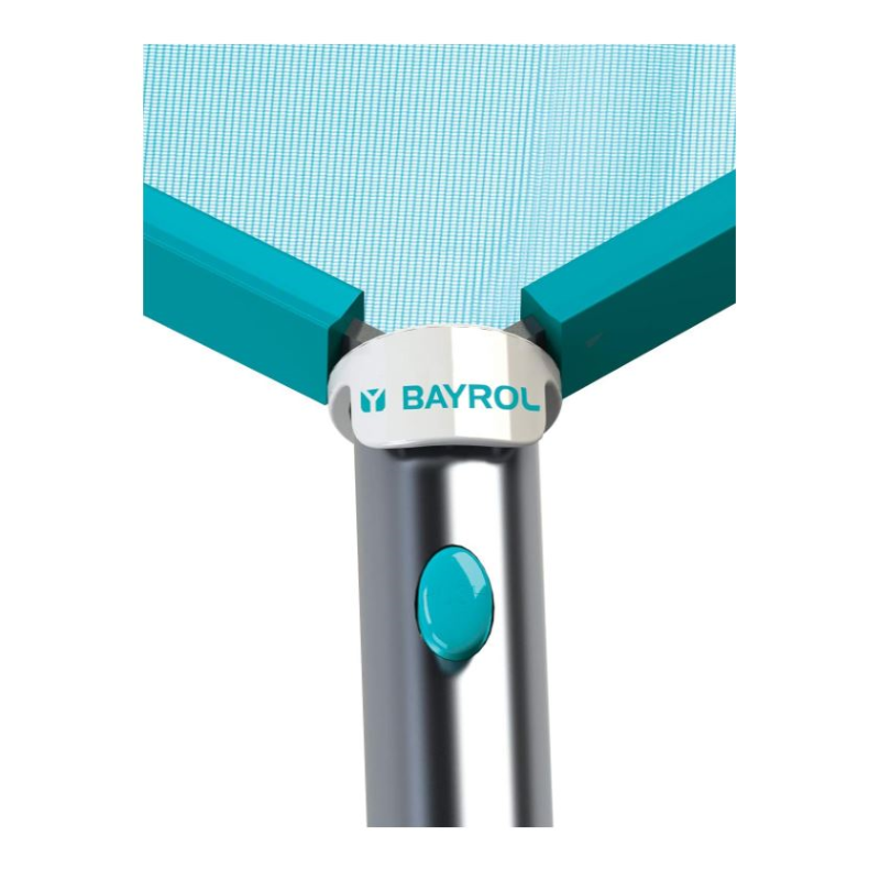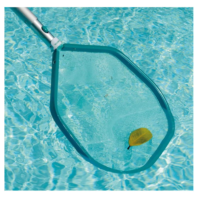 Kescher, flach, aus Aluminium mit Polypropylennetz (selbstreparierend) zum Entfernen von Blättern und sonstigem Schmutz von der Wasseroberfläche. Zentralknopf für eine einfache Handhabung ist vorhanden.