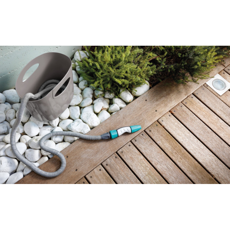 Komplettset selbstausdehnender Schlauch zur Bewässerung von Pflanzen und Blumen. Ideal geeignet für Balkone, Terrassen oder kleine Gärten. Praktisch, leicht und einfach zu Benutzen. Der Schlauch ist 5 Meter lang und dehnt sich bei Wasserdruck auf 15 Meter aus. Nach dem Gebrauch entleert sich der Schlauch selbsttätig und zieht sich auf seine ursprüngliche Länge von 5 Meter zurück. Das Set enthält eine praktische Verstautasche, in der der Schlauch nach dem Gebrauch platzsparend und ordentlich aufbewahrt werden kann.