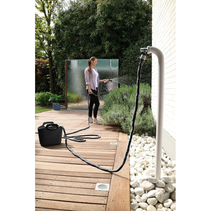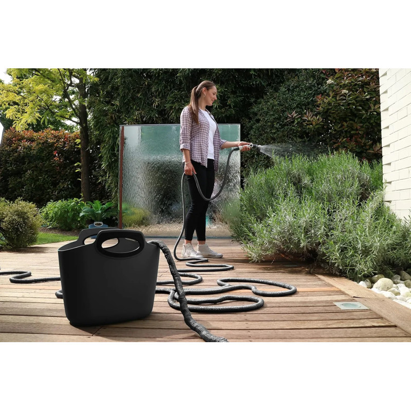 Nach dem Gebrauch entleert sich der Schlauch selbstständig und zieht sich auf seine ursprüngliche Länge von 10 Meter zurück. Das Set enthält eine praktische Verstautasche, in der der Schlauch nach dem Gebrauch platzsparend und ordentlich aufbewahrt werden kann.