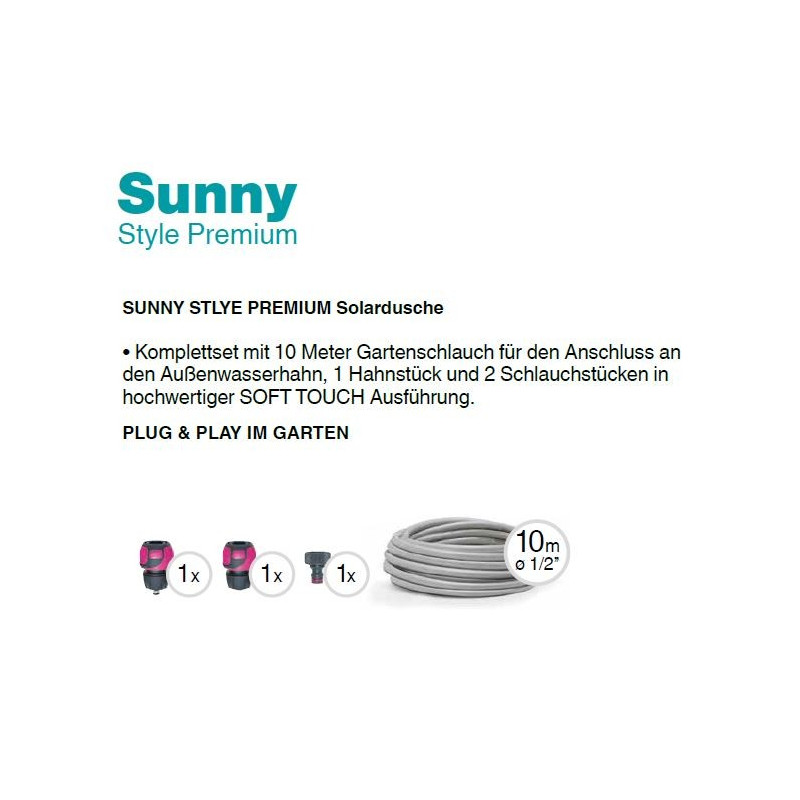Die Solardusche Sunny Style Premium nützt die Energie der Sonne kaltes Leitungswasser auf natürliche Weise und kostenlos zu erhitzen. Sunny wird einfach an den Wasserhahn angeschlossen und schon wird das Wasser im Solarmodul von den Sonnenstrahlen aufgewärmt.