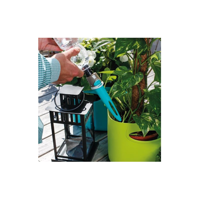 Einfach eine mit Wasser befüllte handelsübliche PET-Flasche auf Aquaflora Holiday stecken. Oben noch ein kleines Loch in die PET Flasche stechen, damit Luft in die Flasche nachströmen kann. Nie mehr den Nachbarn fragen müssen, ob er das Blumengießen während des Urlaubes übernimmt!