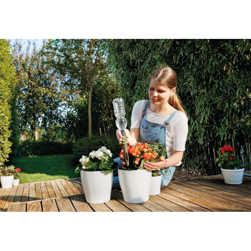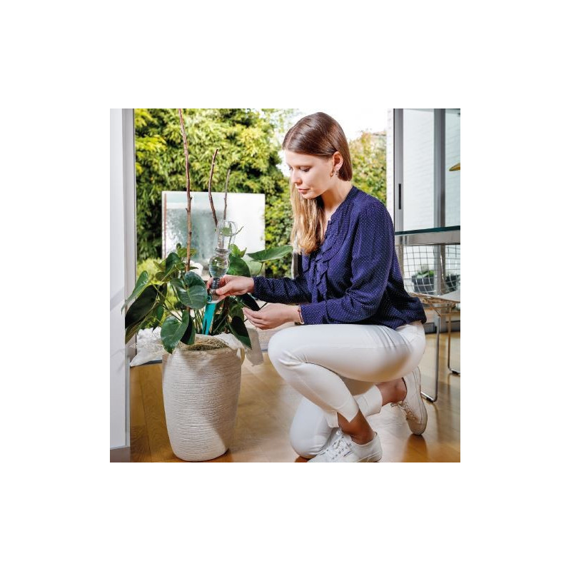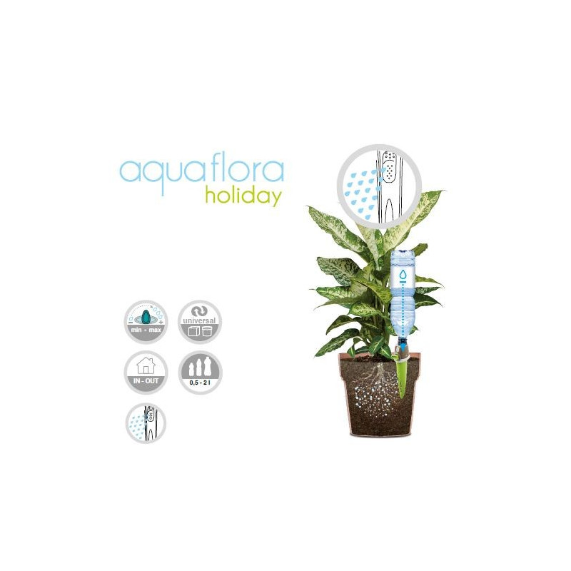 Aquaflora Holiday kann mit jeder gängigen PET-Flasche von 0,5 bis 2 Liter Inhalt verwendet werden. Es bewässert über einen längeren Zeitraum tropfenweise die Pflanze direkt an der Wurzel.