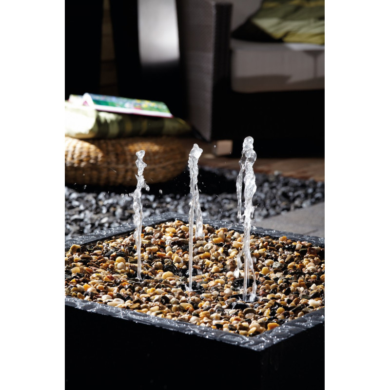 Spritzwasser lässt sich minimieren, indem man ein Becken mit mindestens 3 m Durchmesser wählt. Das Oase Wasserreservoire WR 100 kann dabei z.B. mit Teichfolie erweitert werden. Mit dem Spezialreiniger PumpClean verlängern Sie die Lebensdauer Ihrer Wasserspielpumpen und sorgen für eine dauerhaft hohe Leistungskraft.